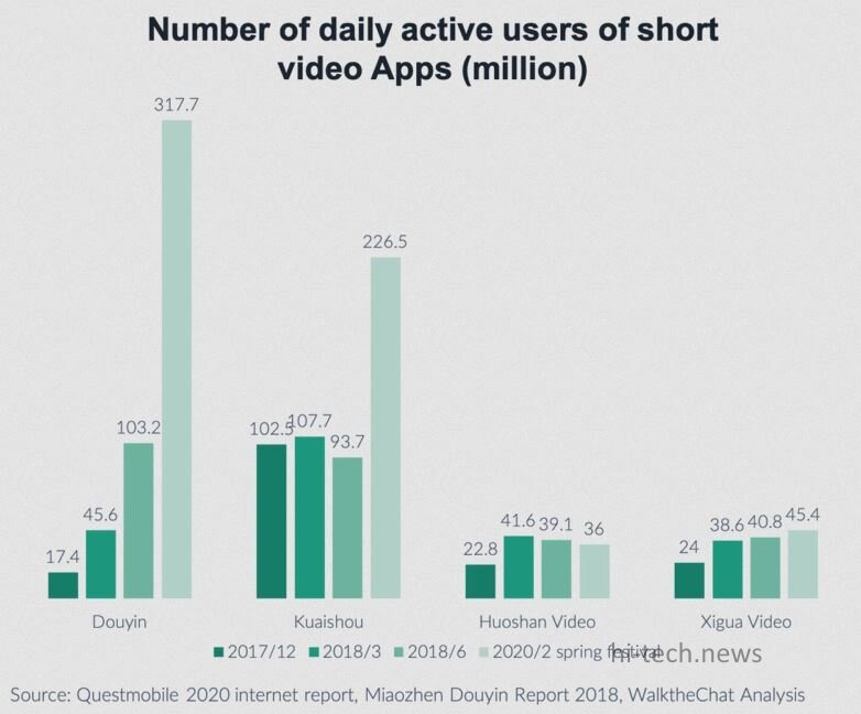 Уже в то время программа наступила на пятки TikTok, и глобальная пандемия, lockdown и более сильная привязка людей к телефонам значительно повлияли на рост популярности обоих приложений. В настоящее время Kuaishou посещает 300 млн человек в день, TikTok (и Douyin) - 600 млн.